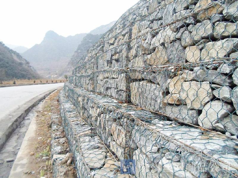 公路加筋網(wǎng)由網(wǎng)孔規(guī)格8 X 10cm 的雙絞合金屬網(wǎng)制成,材料全部采用熱鍍鋅防腐表面處理,一根橫向加筋棒以16厘米為間距穿入擰花鋼絲中間。具有高網(wǎng)帶抗拉強(qiáng)度,高網(wǎng)帶屈服伸長率。